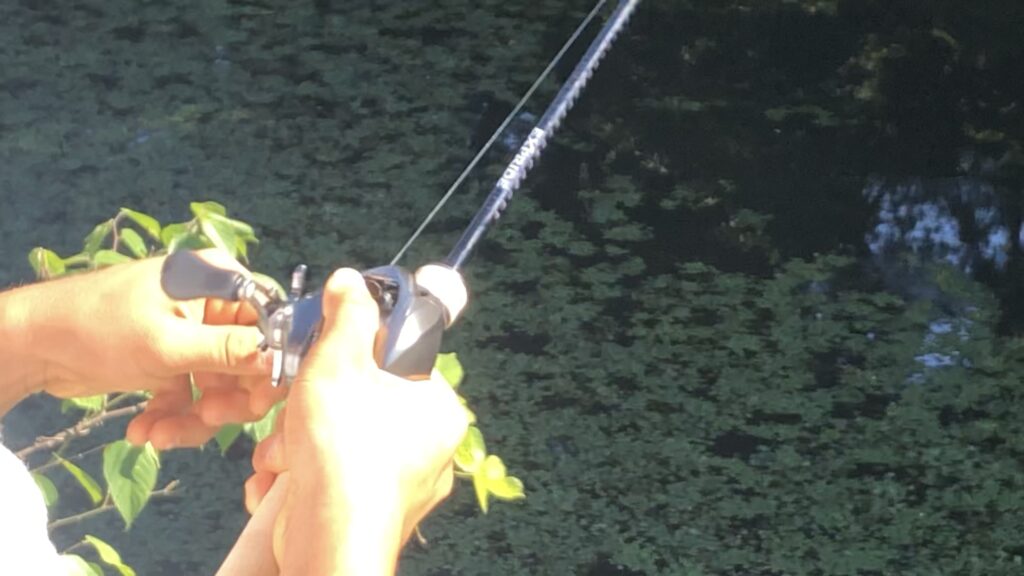 ベイトフィネスは、ライトリグや小型プラグを8-10lbの太いラインで扱えるため障害物周りでの釣りに最適です。また、ピンスポットに正確にキャストを続けていくような状況でもキャストをコントロールしやすいベイトフィネスタックルが有利になります。