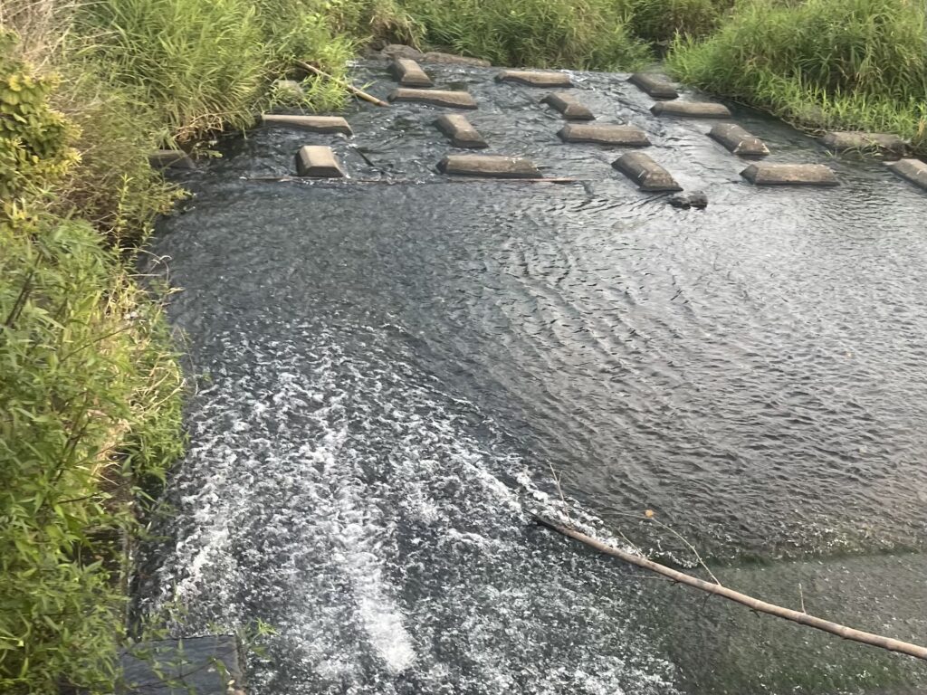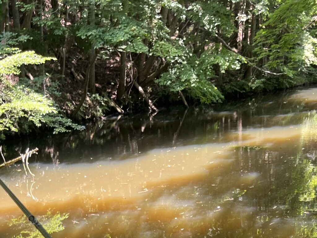 インレッドは、上流の水が流れ込むスポットです。とくに暑いシーズンは快適に過ごせるインレッド付近に集まるブラックバスも多く、魚の影が濃くなります。
