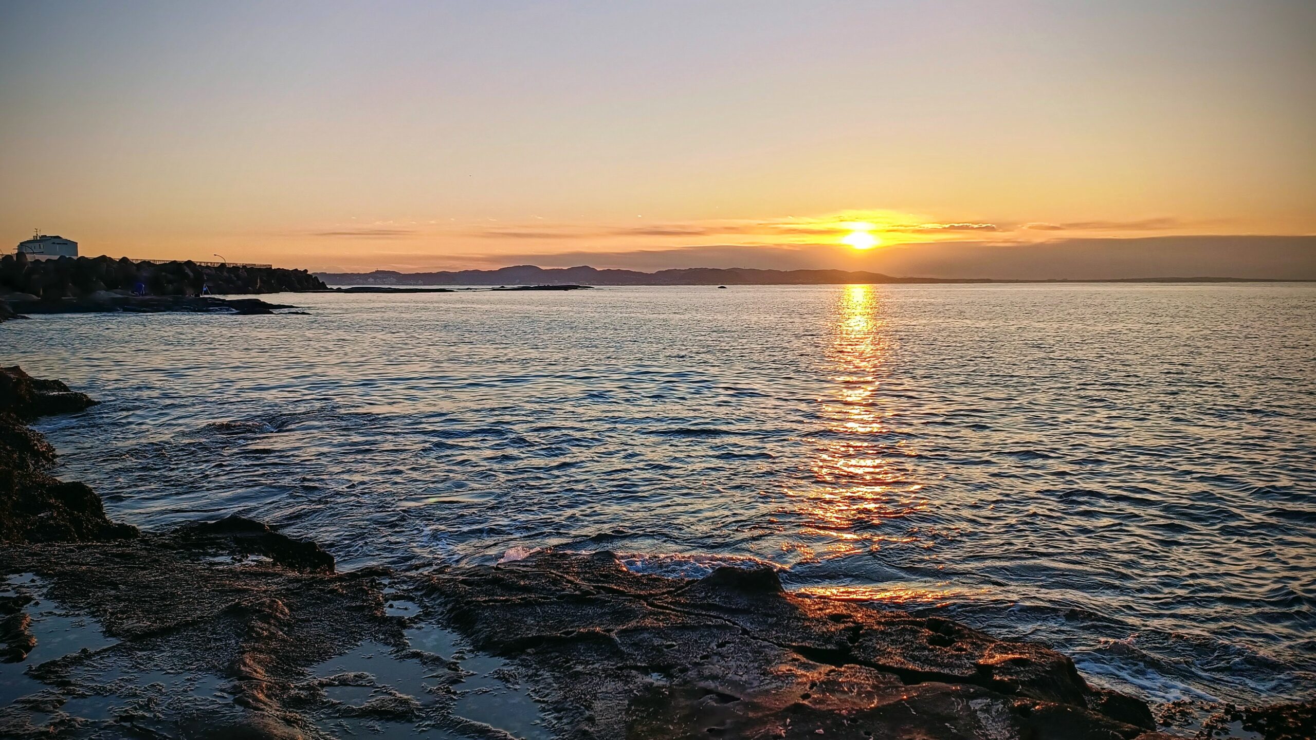 真冬の早暁の江ノ島表磯。夏と比較して太陽が昇ってくる位置がかなり北東(写真左)に移動している。