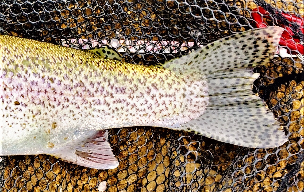 意外と盲点なのがラインのカラーです。水に透過しやすいナイロンやフロロを使用している場合は問題がありませんがPCラインの場合はニジマスから完全に見切られています。でもリーダーを長く取ることで若干回避できます。重要なのはPEラインのカラーを何にするか?太さは0.6~0.8程度が望ましいのです。PEラインのカラーは種類が少なく派手なカラーが多いので注意が必要です。一番無難なカラーはグリーンです、次にグレー、イエロー、ホワイトと続きます。ニジマスは目がいいのでたまにラインにアタックしてきます。