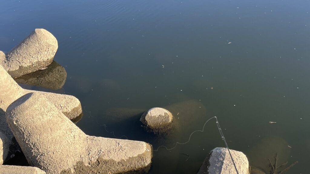 杭やテトラエリアは垂直にフォールするジカリグで誘うのが最適です。フィールド内の杭や立木にはブラックバスがべったりと居着いていることも多く、ジカリグをタイトに落とす必要があります。